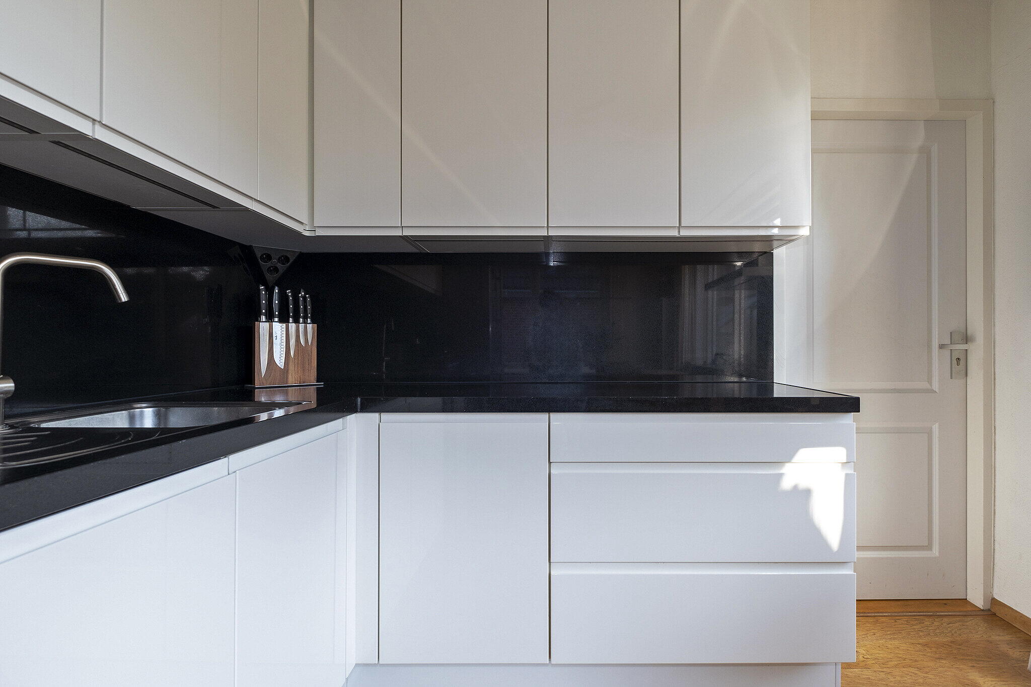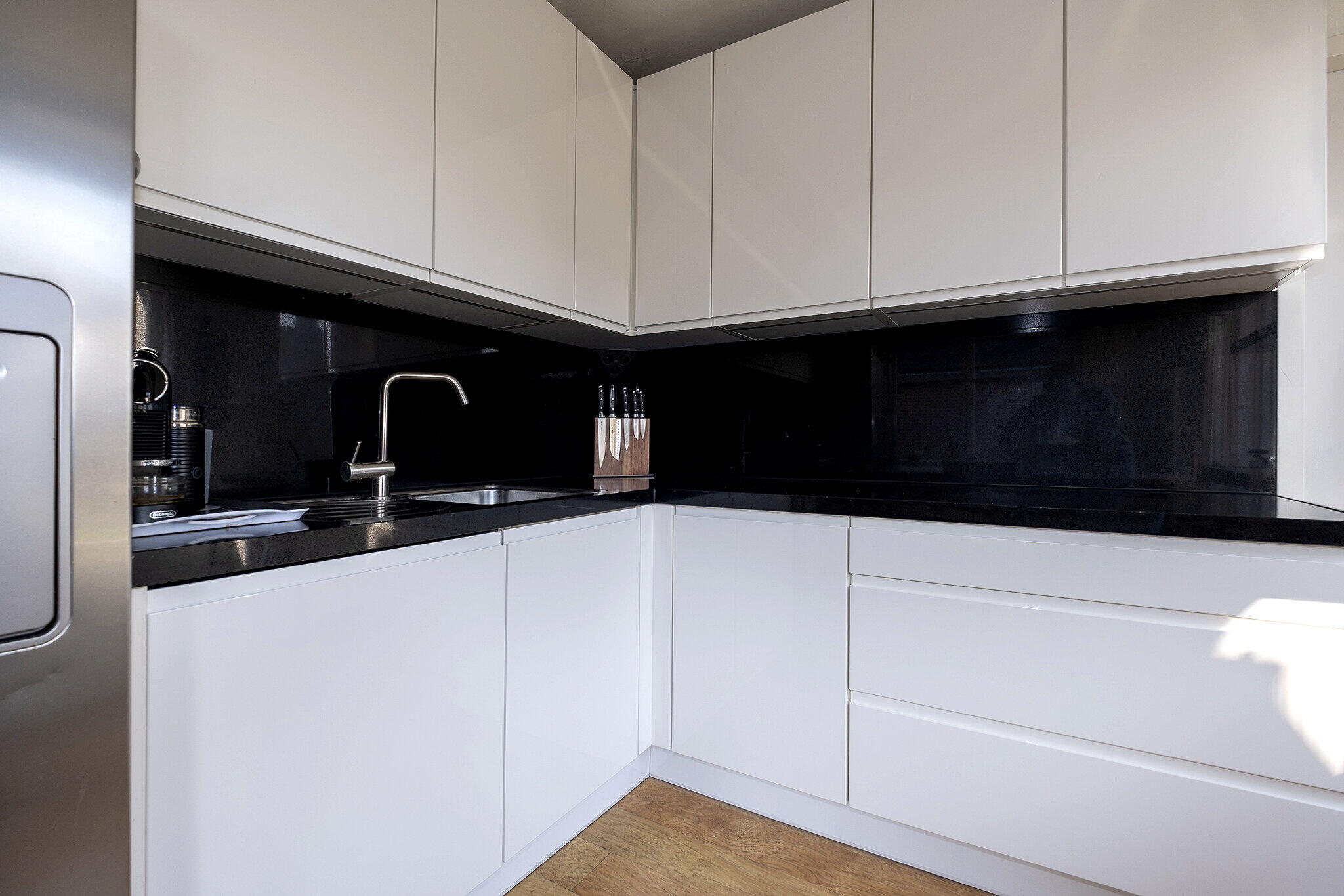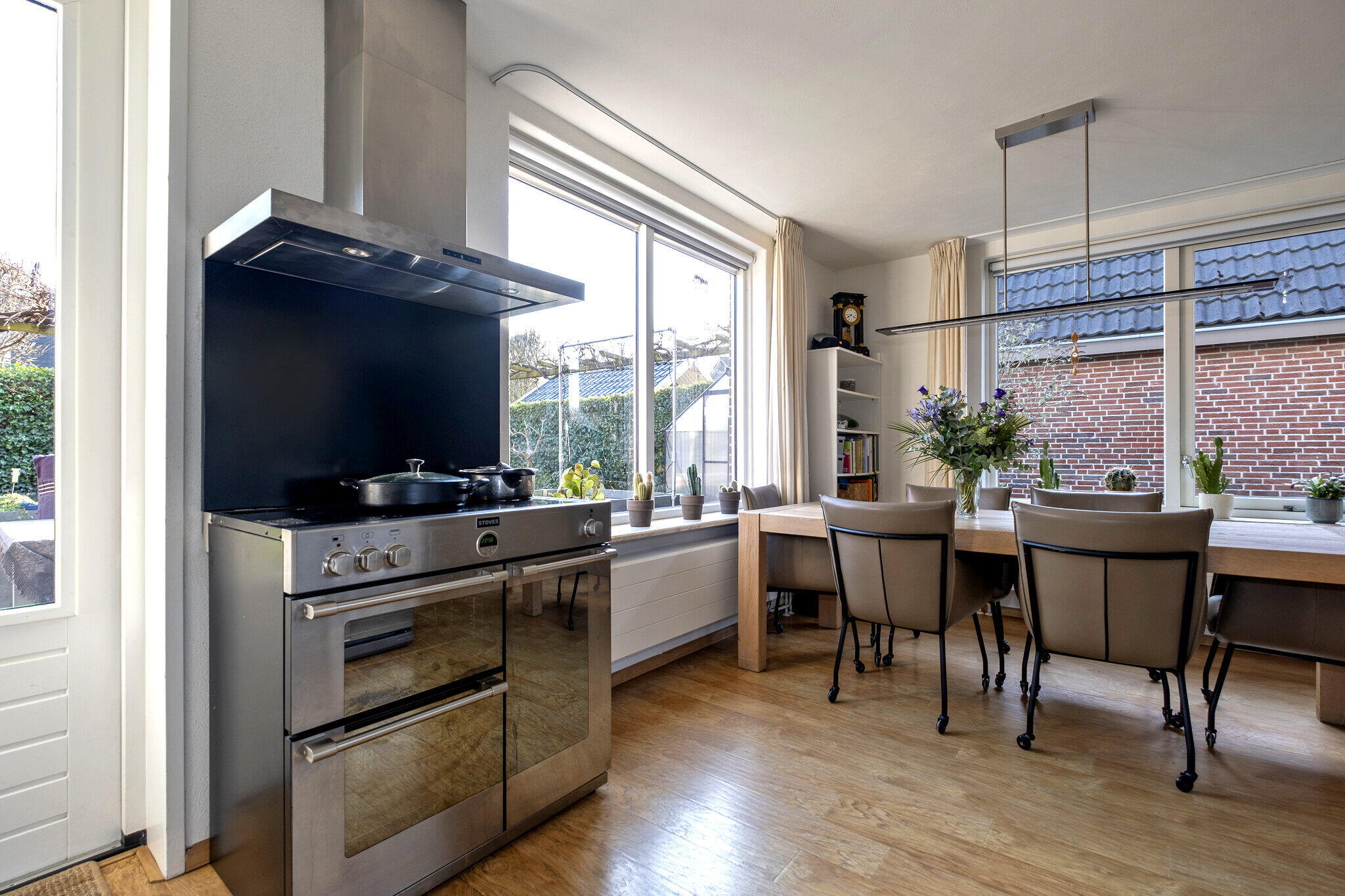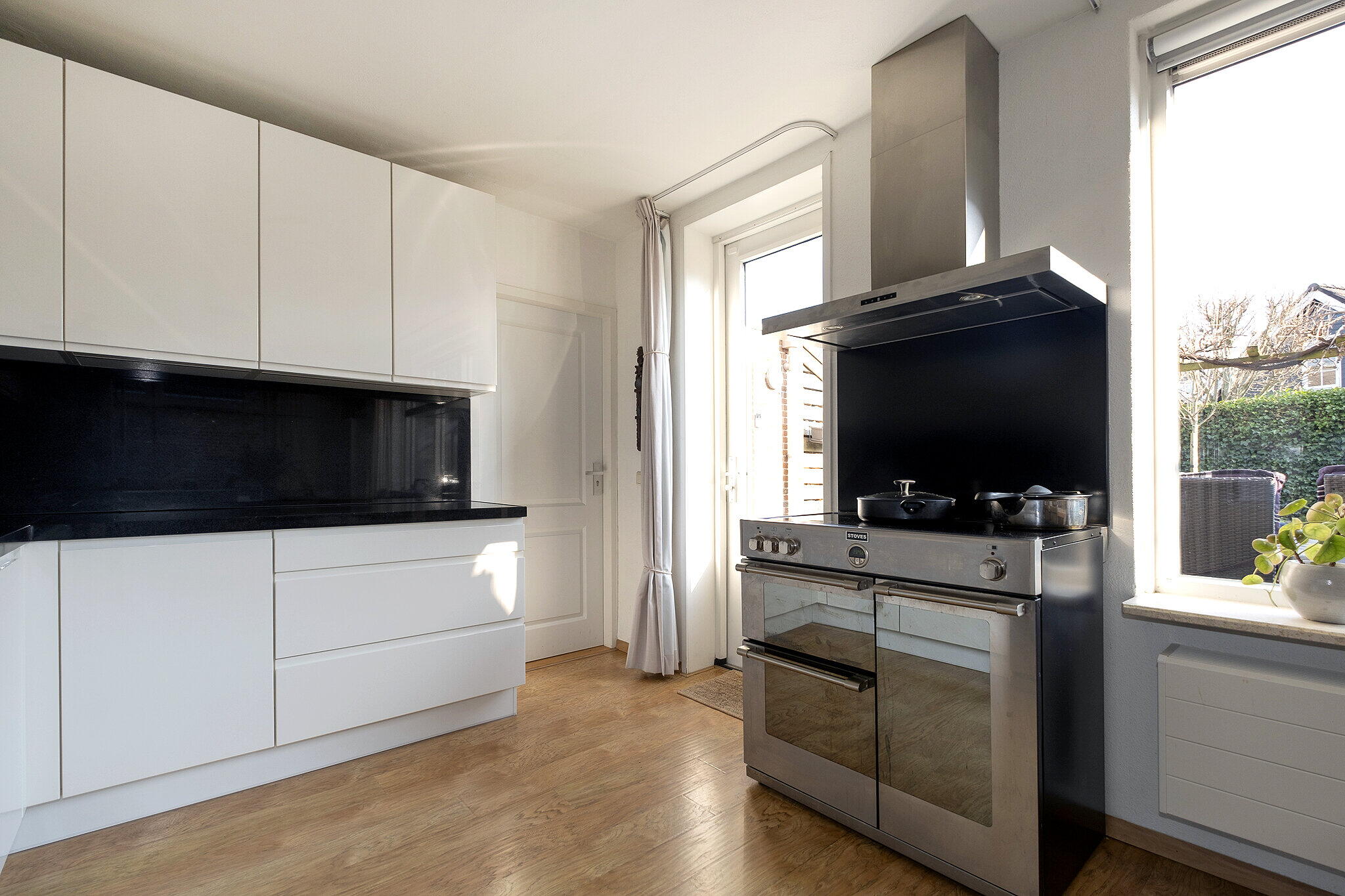Aan de achterzijde van de woning bevindt zich de open keuken (ca. 16 m²). De keuken heeft een moderne uitstraling met witte kastfronten en een zwart stenen werkblad en is voorzien van een los fornuis op inductie met ovens, een losse koel-/vriescombinatie en een vaatwasser.