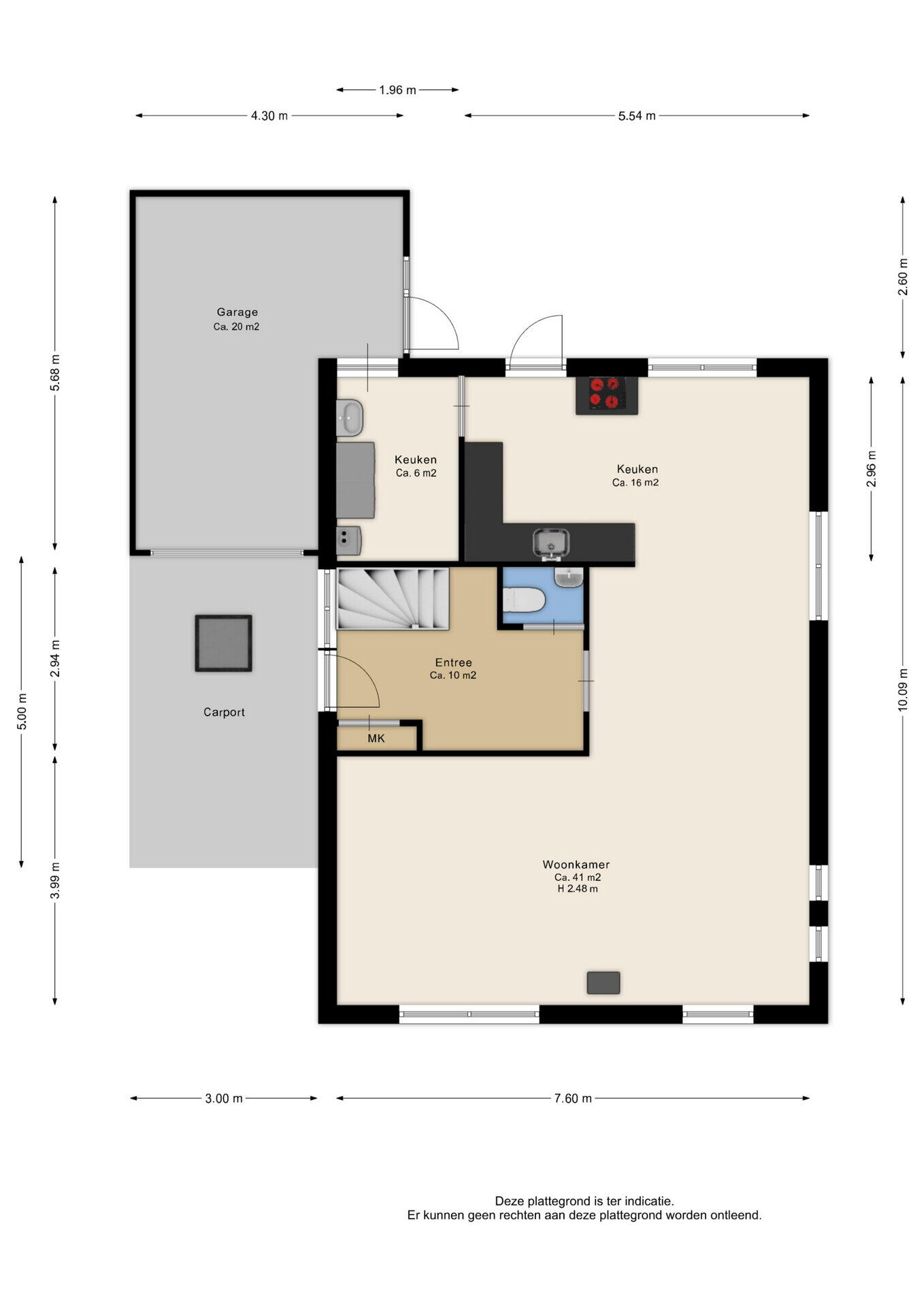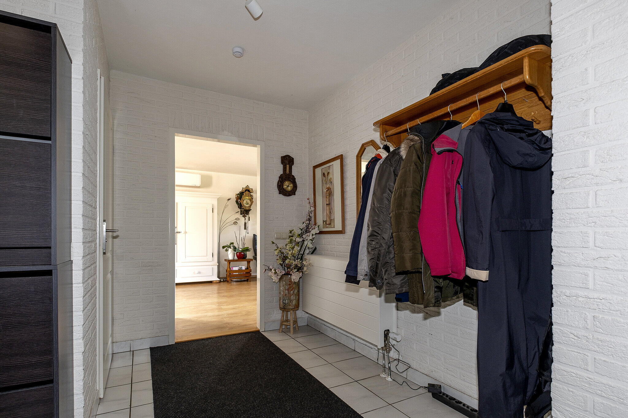 Aansluitend bevindt zich de bijkeuken (ca. 6 m²) met de aansluitingen voor de wasmachine en de opstelplaats van de warmtepomp. Vanuit de bijkeuken is er toegang tot de ruime garage.