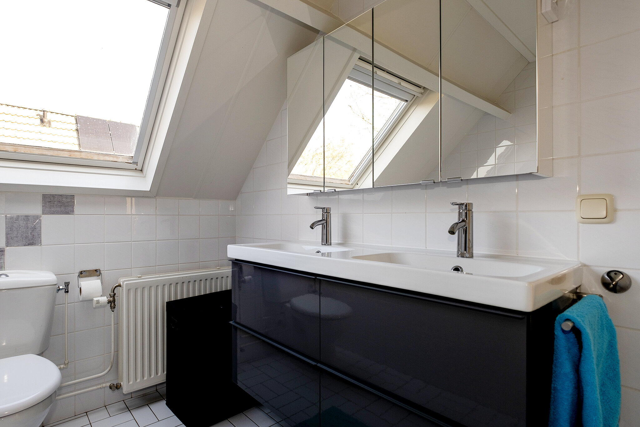 - Ligbad, toilet, douche, dubbele wastafel, wastafelmeubel
